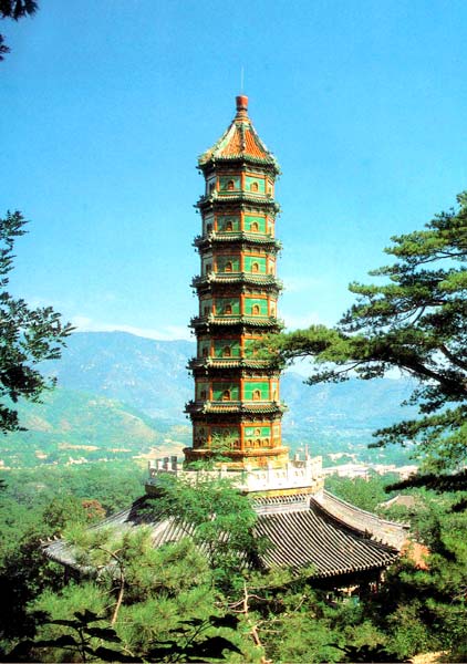 位于昭庙后的琉璃塔是园内唯一的一座宝塔,塔高近30米,分为塔顶安放黄色琉璃宝塔,塔身为黄绿琉璃装饰,整个建筑边雕佛像,层层檐檐缀有铜铃,起风时铃声清脆而悠远。