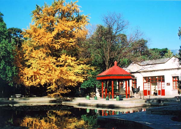 双清别墅位于东南侧,因院中有两股清泉而得名。“双清”二字为乾隆皇帝御笔题写。院内正中有一座六角红亭,旁边是一尊池塘。1949年3月,中共中央进驻香山,毛泽东同志就住在双清别墅,并在此指挥了解放战争中著名的渡江战役。双清别墅现设有上、下两个展室,其中,上展室设有《毛泽东在双清》展览,下展室为毛泽东双清旧居陈列室。